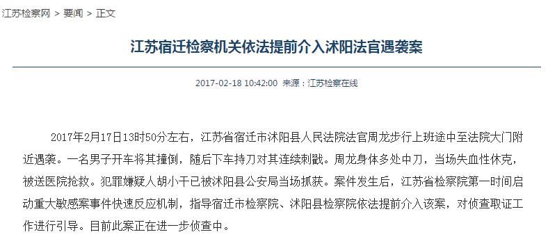 2月17日13时50分左右,沭阳县人民法院周龙法官步行上班途中至法院大门附近,一名男子开车将其撞倒,随后下车持刀对其连续刺戳。周龙法官胸腹部及双上肢多处中刀,肺穿透伤,伤及心包,当场失血性休克。