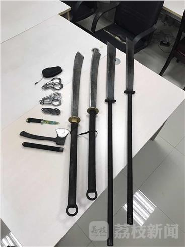 目前,非法携带的管制刀具和警械器具已被收缴,并移交至派出所进行下一步调查处理。