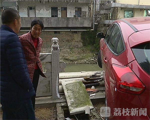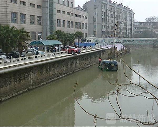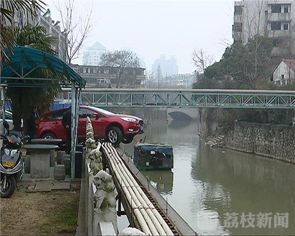 今天(2月20日)早上7点多,在常州溧阳市人民医院附近的河边上,一辆红色的福特轿车撞在了护栏上,车头悬挂在半空中,情况危急。