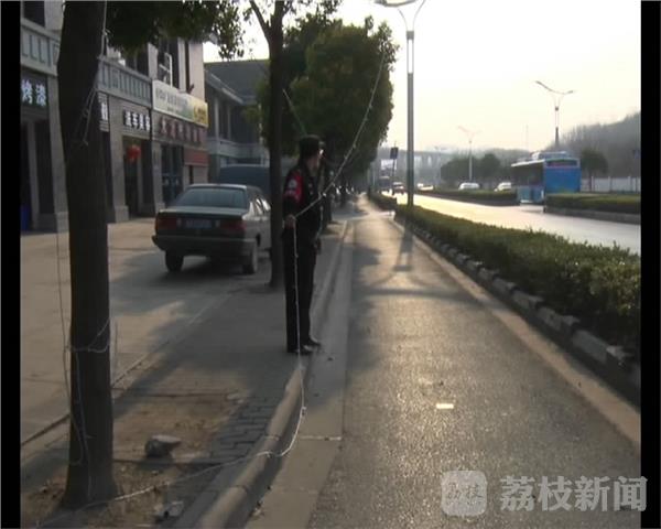 陈女士说,当时她骑着电动车从这里经过,突然从树上掉下一根系着二极管的彩灯线,缠绕着她的脖子,幸亏她当时骑行速度不快,否则后果不堪设想。陈女士越想越后怕,赶紧拨打报警电话,迈皋桥警务站的民警到场发现树上有好多这样的彩灯线。经过询问,路边的一家KTV负责人承认这是他们在圣诞节期间,为了营造节日气氛,悬挂在树上的,结果节日过后忘记将它取下了。没想到昨天下午突然刮起了好几级大风,将彩灯线吹落下来。随后,民警将悬挂在树上的这些彩灯线全部扯下,消除了隐患。KTV负责人向陈女士表示了歉意。