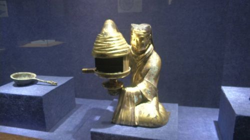 长信宫灯也是国宝级文物,出土于西汉第一代中山靖王刘胜的妻子--窦绾之墓。据专家介绍,这件长信宫灯就是一个宫女,神情肃穆,举着一个灯的形象。这个灯的设计非常巧妙,可以通过前面灯罩的挡板,来调节灯光的照射角度。另外烟可以通过宫女的袖筒吸到她的体内,使室内保持干净清洁。