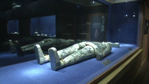 展品中有一件出土于东汉中山王刘焉墓的玉衣,距今已有2000年的历史,但在灯光下,仍然熠熠发光。专家介绍,整个玉衣由近千玉片编织而成,严丝合缝,异常精美。汉代人特别迷信,他们相信玉石可以让他们的尸身不朽,可以让他们顺利地投胎转世,所以就制作了玉衣殓葬尸体。能够使用金缕玉衣或者玉衣来随葬的,都是王侯等级的人。