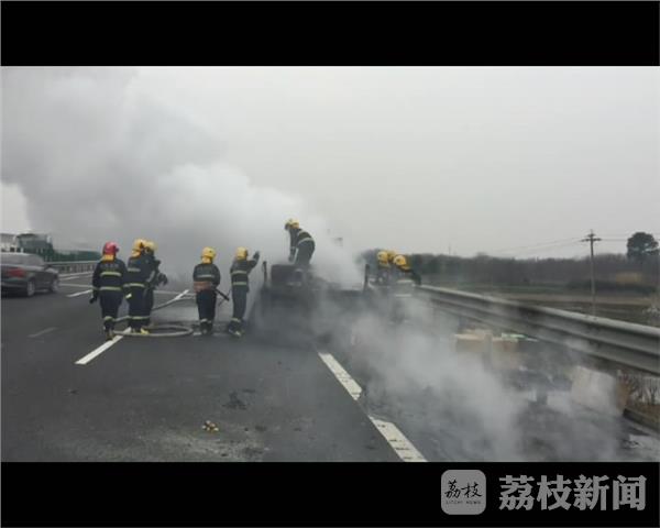 起火的是一辆蓝色中型货车,此时货车已经停在应急车道上,车厢部位还在冒烟燃烧,地上扔了好几个纸箱。消防官兵立即对起货车厢扑救,几分钟后大火被扑灭,为防止货车油箱起火,消防官兵用水枪对油箱进行了冷却。