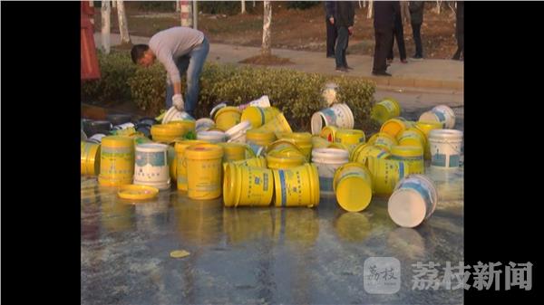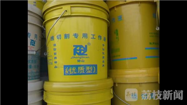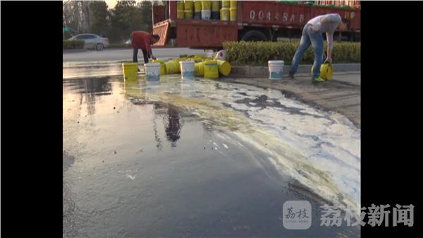 桶身上写着'线切割专用工作液'的字样。当地街道和环境部门工作人员赶到后,用沙土对路面液体进行覆盖。