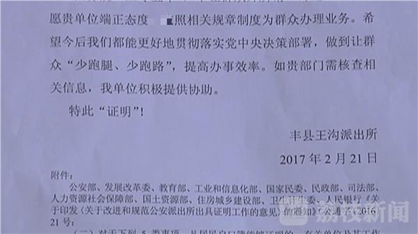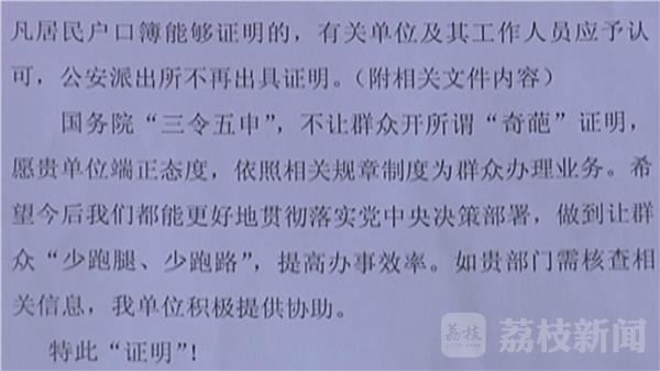 按照公安部等十二部委下发的《关于改进和规范公安派出所出具证明工作的意见》,凡居民户口簿能够证明的,有关单位及其工作人员应予认可,公安派出所不再出具证明。徐州丰县公安局户政管理中队中队长 李金铃:“当时我们这边下着大雪 ,看着群众很无奈的样子 ,就给群众出具了一份不是证明的证明。”
