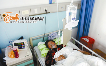 昨日上午,记者来到矿山医院住院部13楼11床见到了伤者梁老太。梁老太躺在病床上正在打着吊水,老太表情痛苦,脸上有血迹,眼睛也肿了。梁老太痛苦的称,自己现在头脑昏昏沉沉的,腿疼的不能走路,“不过比昨天好多了,昨天是疼痛难忍,不能吃不能喝”。