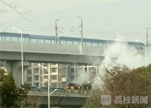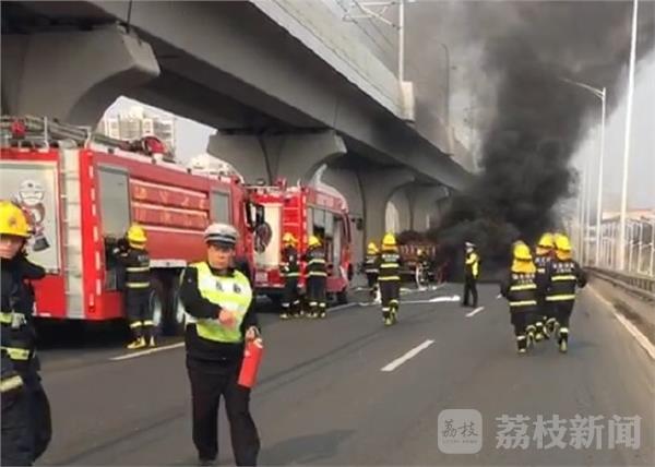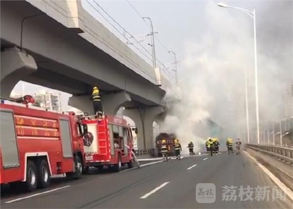 今天(2月26日)下午,南京江北大道快速路上,一辆大货车行驶到范旭东广场附近时,突然冒起滚滚浓烟并且迅速燃烧,司机发现车厢部位开始冒烟燃烧,赶紧靠边停车,市民发现后迅速报警,化工园消防接到报警后火速赶到现场将大火扑灭,由于事故车辆所占车道被临时封闭,交通一时受到影响,具体燃烧原因目前消防部门正对起火原因进行调查。警方呼吁驾驶员朋友,开车上路一定要对车辆进行一次检查,避免行驶中发生意外。