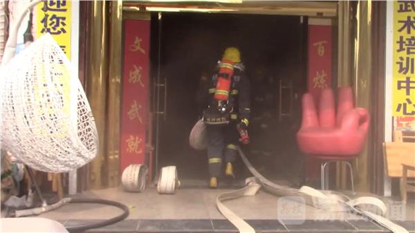 消防队员赶到现场后看到,一家沿街店铺不停向外冒黑烟,屋内烟雾弥漫,视线不清。据了解,起火的是四楼培训中心的卧室,隔壁厨房内还有一只煤气罐,情况十分紧急。消防队员赶到后,迅速铺好水管,登楼灭火。