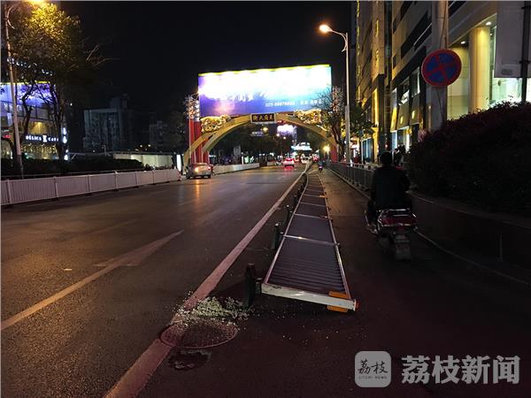 晚上7时30分,笔者骑车路过汉中路与王府大街路口,新街口高楼林立,仍阻挡不住西北大风的势虐,风在楼与楼之间的的缝隙中乱窜,树叶、杂物腾空卷起,骑车在路上的行人吹得摇摇晃晃,连固定路面上的数十米长马路隔离栏也被风刮倒,并不断扩大。