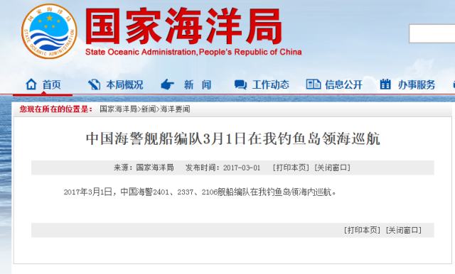 2017年3月1日,中国海警2401、2337、2106舰船编队在我钓鱼岛领海内巡航。