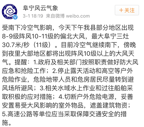 最新气象预告:预计傍晚至夜里,阜宁将出现10级以上阵风