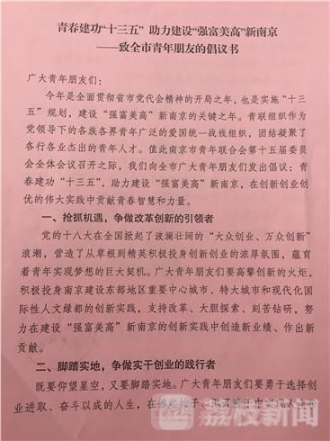 会上,还发出了致南京青年的一封信,鼓励每一位青年成为各自领域事业的领头羊,有影响力、传播力的“自媒体”,助力建设“强富美高”新南京。