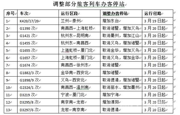 为满足客流需求,调整部分旅客列车办客停站。具体为,自3月19日始发站起,兰州—泰州K420/17/2次增加东台办理客运业务。自3月20日始发站起,南昌西—上海虹桥G1390次取消诸暨,增加义乌;杭州东—昆明南G1421次取消衢州,增加江山;杭州东—南昌西G1455次取消义乌,增加诸暨;上诲虹桥—厦门北G1655次取消金华,增加义乌;上海虹桥—厦门北G1657次取消义乌,增加金华;南昌西—徐州东G1674次取消诸暨;金华南—西安北G1882/3次增加诸暨;义乌—西安北G1898/9次取消德清,增加诸暨;南昌西—温州南G2324/1次取消丽水、增加衢州;宁波—厦门北D3219次增加宁海;南京南—龙岩D3295/8次增加溧阳;龙岩—南京南D3297/6次取消德清。