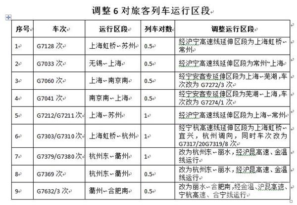 调整6对高铁旅客列车运行区段,分别为上海虹桥—苏州G7128次0.5对经沪宁高速线延伸区段为上海虹桥—常州;无锡—上海G7033次0.5对经沪宁高速线延伸区段为常州~上海;上海—南京南G7060次0.5对经宁安客专延伸区段为上海—芜湖,车次改为G7272/3次;南京南—上海G7041次0.5对经宁安客专延伸区段为芜湖—上海,车次改为G7274/1次;上海—苏州G7212/G7211次1对经沪宁高速线延伸区段为上海—常州;上海虹桥—杭州G7303/G7310次1对经宁杭高速线延伸区段为上海虹桥—宜兴,杭州调向,同时车次改为G7317/20G7319/8次;杭州东—衢州G7379/G7380次1对运行区段改为杭州东—丽水,经沪昆高速、金温线运行;杭州东—衢州G7369次0.5对运行区段改为杭州东—丽水,经沪昆高速、金温线运行;衢州—合肥南G7632/3次0.5对运行区段改为丽水—合肥南,经金温、沪昆高速、宁杭高速、合宁线运行。