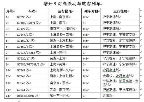 增开9对旅客列车,其中G字头旅客列车8对,动车旅客列车1对。分别为,上海—南京南G7096次0.5对,经沪宁高速线运行;上海—南京G7100/G7099次1对,经沪宁高速线运行;南京南—上海虹桥G7127次0.5对,经沪宁高速线运行;上海虹桥—芜湖G7148/9次0.5对,经沪宁高速、宁安客专线运行;芜湖—上海虹桥G7150/47次0.5对,经宁安客专、沪宁高速线运行;上海虹桥—芜湖G7152/3次0.5对,经沪宁高速、宁安客专线运行;上海—苏州G7214/G7213次1对,经沪宁高速线运行;芜湖—上海G7220/17次0.5对,经宁安客专、沪宁高速线运行;上海—芜湖G7286/7G7288/5次1对,经沪宁高速、宁安客专线运行;上海虹桥—义乌G7347次0.5对,经沪昆高速线运行;丽水—上海虹桥G7348次0.5对,经金温线、沪昆高速线运行;南京南—丽水G7643次0.5对,经宁杭高速、沪昆高速、金温线运行;义乌—南京南G7644次0.5对,经沪昆高速、宁杭高速线运行;温州南—丽水D5592/D5591次1对,经金温线运行。