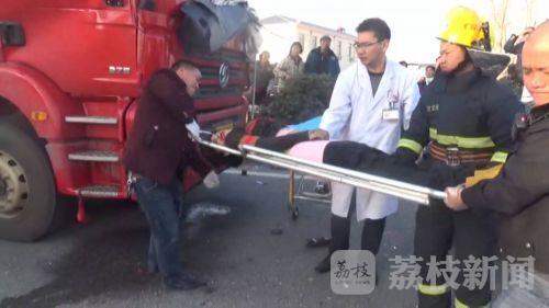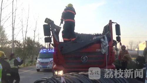 现场一卷钢线圈滚落在地,货车的驾驶室已经被完全压平,驾驶室中的一男一女两人都被困在了车中无法动弹。消防队员迅速爬上车头,勘查内部情况,医护人员也为伤者打起点滴,维持生命体征。消防车展开吊臂,试图拉开严重变形的车顶。
