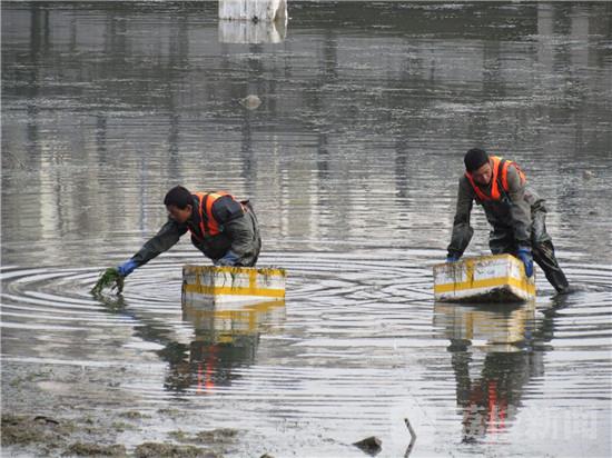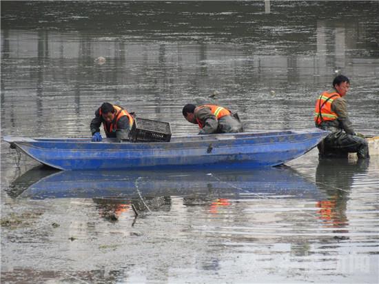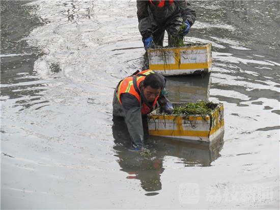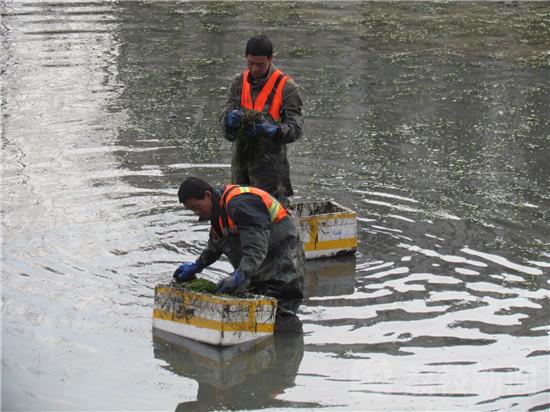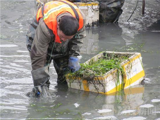 3月3日下午,在南京外秦淮河副支(象房村泵站-通济门桥),发现河道内十几位工人,正在河底栽种苦草,以“生物操纵控藻引导水体生态修复技术”治理河道,成为了城市河道自净生态系统构建。