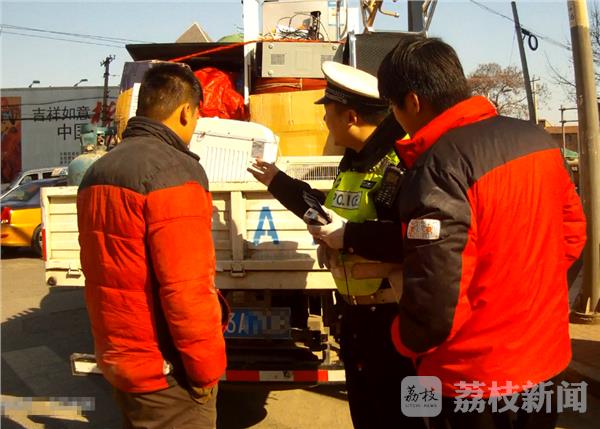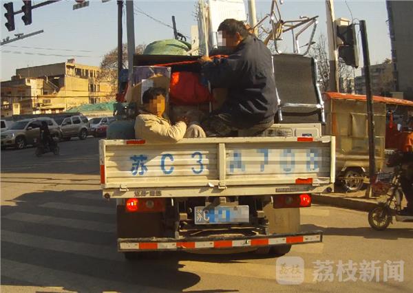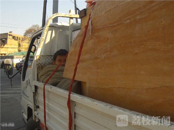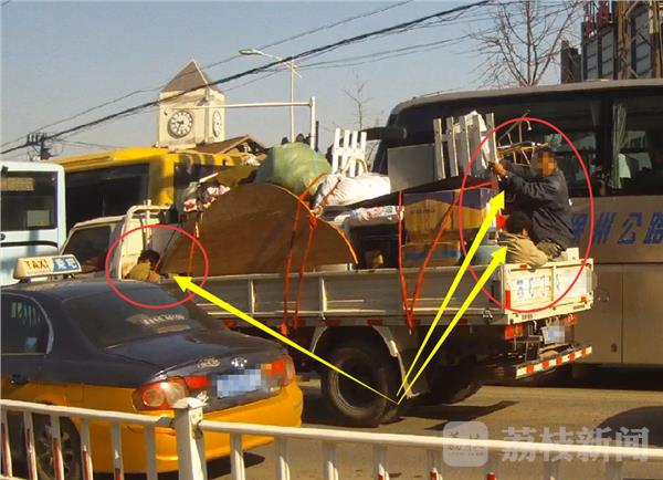 3月3日中午,徐州鼓楼交警在鼓楼区庆祝楼路口执勤时,发现一辆搬家公司的小货车上满载货物,而在车厢尾部和前部的夹缝中竟然躺了三个人,三人姿势各异,完全没有意识到其中的危险。