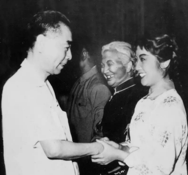 △1964年,全国京剧现代戏汇演。周恩来总理接见演员。