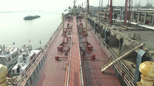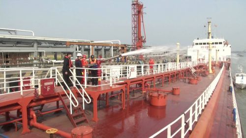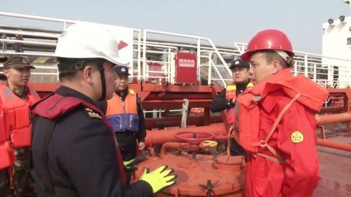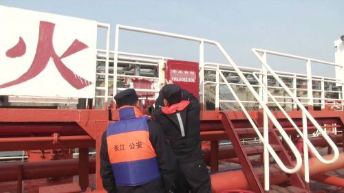 在长江仪征段一码头,执法人员登上一艘大型油船,检查水枪、水炮等消防设施。根据规定,水枪喷水的最远距离要达到12米水柱,消防炮的压力也需要达到相关要求,该油船的设施还不能完全达到标准,执法人员对此进行了安全教育。随后执法人员又进入船舱,对控制室内高位报警装置、船员证件等一一核查。