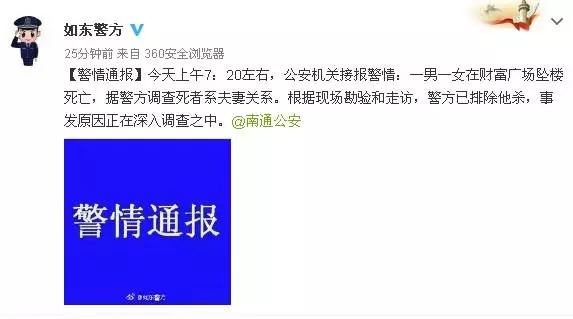 2017年3月6日7时许,如东警方接到报警称:掘港镇幸福路财富广场小区有一对男女跳楼。接报后110指挥中心立即指令掘港所、刑警五中队出警,并通知120。经120现场确认二人已经死亡。