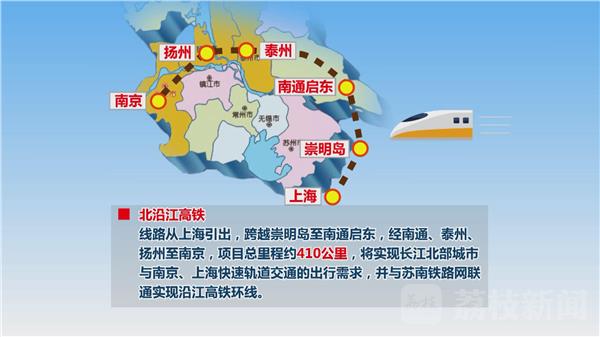 北沿江高铁,线路从上海引出,跨越崇明岛至南通启东,经南通、泰州、扬州至南京,项目总里程约410公里,设计时速达到350公里,将实现长江北部城市与南京、上海快速轨道交通的出行需求,并与苏南铁路网联通,实现沿江高铁环线。