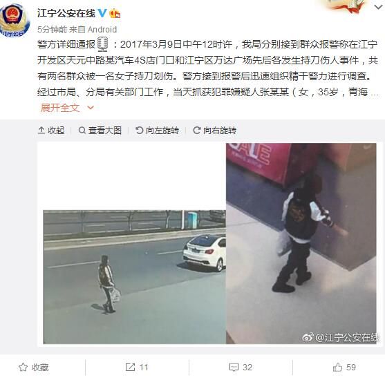 2017年3月9日中午12时许,我局分别接到群众报警称在江宁开发区天元中路某汽车4S店门口和江宁区万达广场先后各发生持刀伤人事件,共有两名群众被一名女子持刀划伤。警方接到报警后迅速组织精干警力进行调查。经过市局、分局有关部门工作,当天抓获犯罪嫌疑人张某某(女,35岁,青海省人),张某某对持刀伤人的有关案情供认不讳,目前张某某已被刑事拘留,此案正在进一步调查中。