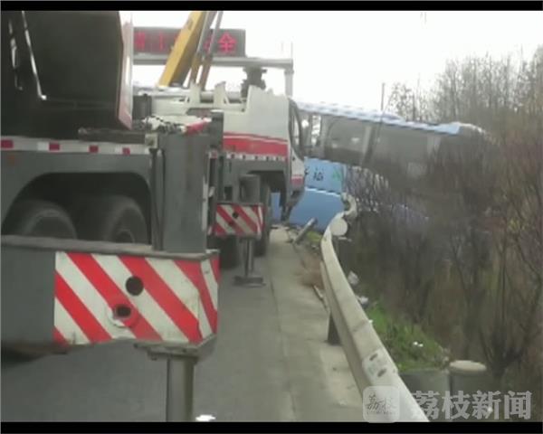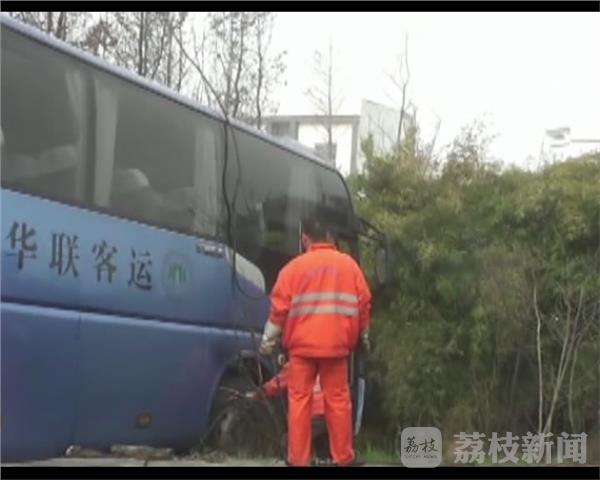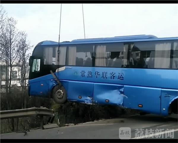 3月11日7点左右,常台高速与苏绍高速交界附近处发生一起事故,一辆满载乘客的大巴车冲下高速,冲断栏杆,车头摔落到水沟里,而车尾还横在路上,十米栏杆被冲断。大巴驾驶员介绍,当时他驾驶这辆大巴车从常熟去浙江,车上满载了40多名老年游客,行驶到事发路段时,车子剧烈震动,掌握不住方向,后视镜里发现后轮竟然掉了,赶紧刹车,车子还是失控翻到沟里。