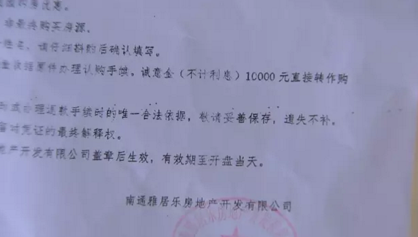 南通开发区雅居乐花园三期,吸引超过一千名消费者参与认筹。临近开盘,毛坯房改售精装修的消息不胫而走,开发商的突然变卦让参与认筹的消费者无法接受。今年2月份,季先生向开发区雅居乐缴纳了1万元认筹金。眼看三期开盘在即,销售顾问却突然告诉他这样的消息。认筹消费者季先生:购房时要写两份合同,一份是原本买毛坯房的合同,还有一份是装修的合同,也就是说开发商强制性地给业主装修,让业主出这笔钱,等于变相地提高了购房者的首付款。