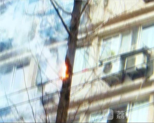 在南京洪武南路八条巷,一根电线突然失火,并引燃了旁边的树木。今天天气是刮风下雨,万一电线导电伤人,麻烦就大了。供电公司抢修人员闻讯后,立即赶往了现场。