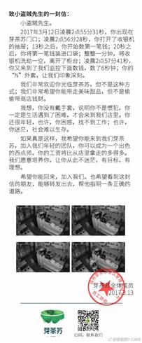 据朱老板介绍:3月12号营业员进店准备点钱箱,发现钱箱里面已经没有钱了,营业员就问我取钱没有,我称没有,随后通过监控看到,是一名20多岁的男青年凌晨两点多钟把门锁撬开,随后走到吧台偷走钱箱里面的2600多块钱,通过监控看到,当时吧台还有手机和笔记本,小偷肯定也看见了,但是他直接偷了钱,可以看出小偷肯定是缺钱,可能工作生活上遇到困难了,看他样子也不是专业的小偷,我们也希望社会宽容点,我发这个通告也是希望小偷能改过自新,自己能学门技术通过劳动得到钱养活自己,我们店里的员工师傅都很年轻和他差不多大,希望小偷他能看到这个通告,知道自己错了,我们是能够接纳他的 ,来这里培训他做个西点师,靠自己双手努力赚钱。