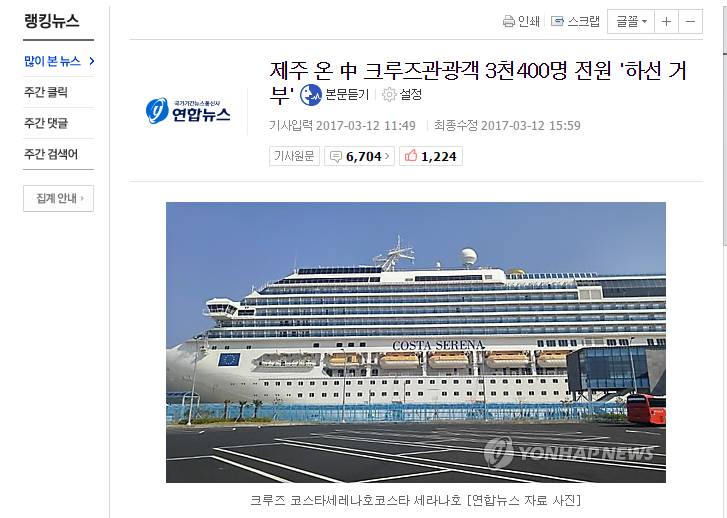 【韩媒:3400名中国游客韩国济州岛拒下国际邮轮】
