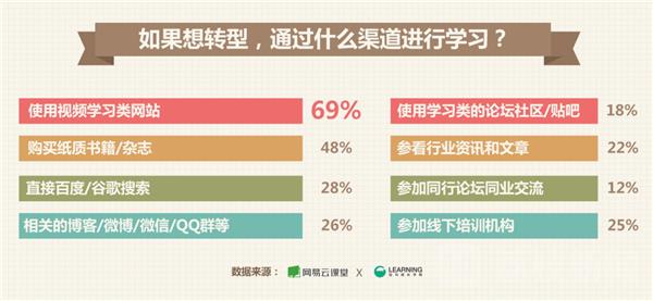 虽然现在学习途径很多,但通过视频学习类网站学习成了最主流的学习渠道。报告显示,接近7成有转型经历的职场人都选择了该渠道。另外,通过购买纸质书籍杂志、关注相关微信微博论坛以及参加线下培训机构等都成为了有效的学习渠道。大数据显示,在网易云课堂学习用户中,有超过21%的用户学习目的是为了考虑转型或者正在为转型积累相关职业技能,在他们中间,最受欢迎的三大技能类课程分别是IT互联网类、提高PPT技巧类和设计类的课程。