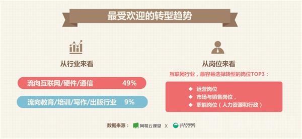 从跨行转型来看,最大的行业流动是从传统行业流向互联网行业;其次是转型去教育/培训/写作/出版行业。