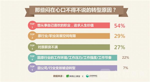 虽然每个职场人选择职业转型的原因都不尽相同,但归纳起来主要有以下方面。首先就是想从事自己喜爱的职业,追求自我人生价值实现。网易云课堂与拉勾网联合发布的这份报告显示,参与调查的职场在职人员中,有2成的人对目前的工作不满意,并且有超过5成的人主要是为了追逐自己喜欢的行业与岗位而选择转型。