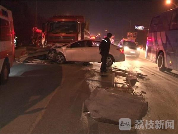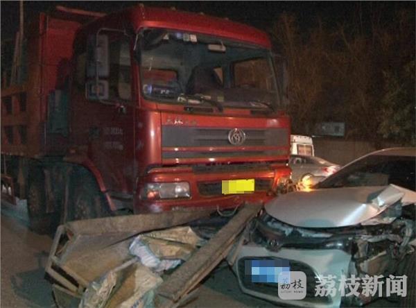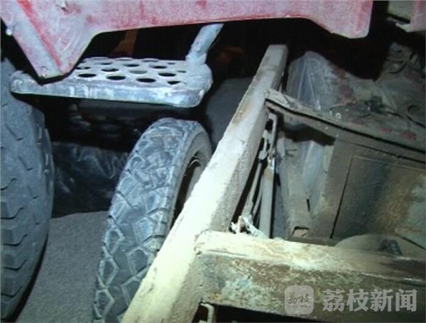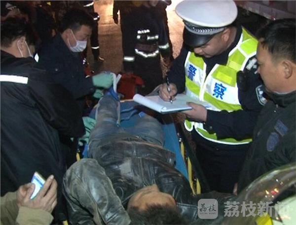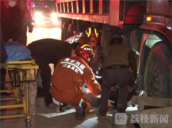 3月14日晚上7点30分左右,在江宁区104国道上坊段,一辆轿车与一辆电瓶三轮车相撞,电瓶车司机蔡师傅被撞跌落到对面车道正常行驶的装满钢管的工程车车肚下,蔡师傅被卡在工程车车肚,动弹不得。在现场看到,三辆车挤在一起,电动三轮车已散架,轿车受损严重。报警后,120、东山交警和消防立即赶到现场,消防员用千斤顶将工程车顶起,10分钟后将蔡师傅救出。所幸蔡师傅无生命危险,随后被120送往医院救治。