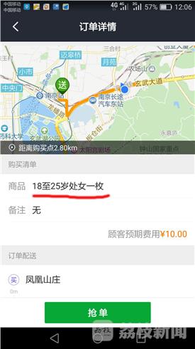 3月15日中午,在南京美团骑手的微信群里,有一张客人“帮买”的奇葩订单在群里飞传:帮买商品:18至25岁处女一枚,送凤凰山庄11栋,限时59分钟内送达,客人预付骑手帮买费10元。