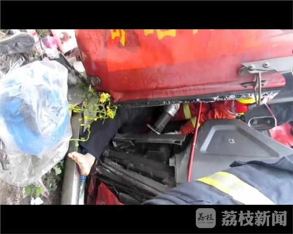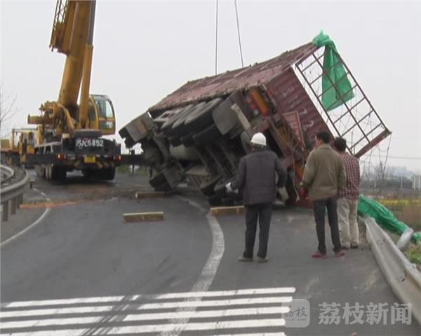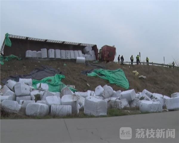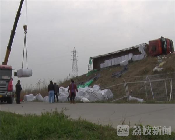 参与现场施救的人员说,车上共有2人。当时,正运载着几十吨棉丝品从扬州开往南京,结果在事发路段发生侧翻。