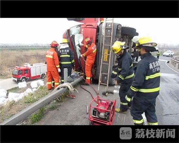 今天(3月16日)上午7点左右,在宁通高速公路南京六合山北立交上匝道上,一辆河南牌照的大货车发生侧翻,司机被困在驾驶室内出不来,当地消防和民警等迅速赶到现场救援。