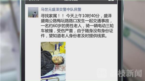 昨天上午10时40分,苏州市盛泽盛南公路梅坛路路口发生一起交通事故,一名约60岁的男性老人,骑一辆电动三轮车被撞,受伤严重,由于随身没有身份证件,望知道老人身份者及时提供线索。根据朋友圈的线索,记者在吴江盛泽医院的ICU病房见到了被撞的老人。