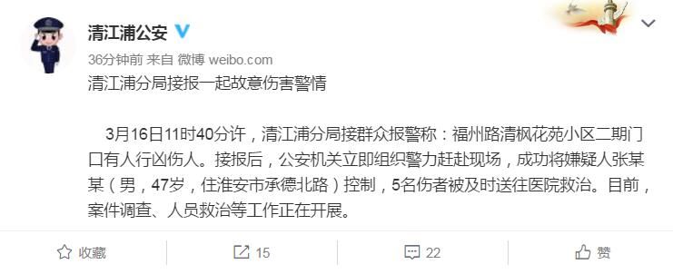 3月16日中午11时40分许,在淮安区清江浦区清枫花苑门前发生行凶伤人事件,多名无辜路人受伤。公安机关立即组织警力将犯罪嫌疑人张某某(男,47岁)控制。5名受伤者被送往医院救治。目前,案件调查,人员救治工作正在开展。