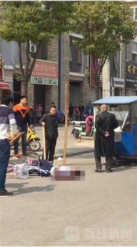 事发现场:附近年轻男子拿木棍、凳子等将嫌犯围住