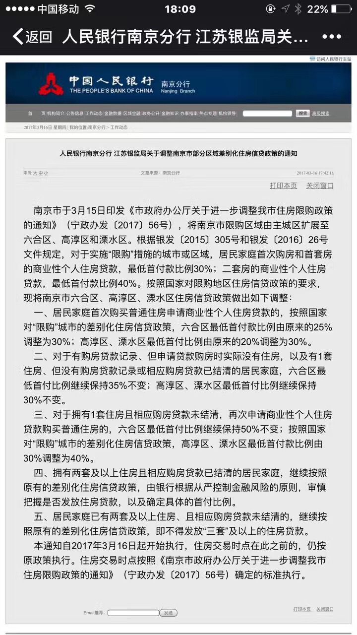 继 3 月 15 日南京限购政策升级后,3 月 16 日下午,人行南京分行在官网上发布了《江苏银监局关于调整南京市部分区域差别化住房信贷政策的通知》。本次房贷调整是针对 3 月 15 日限购政策的对位调整,对六合区、高淳区和溧水区的房贷首付比例进行上调。
