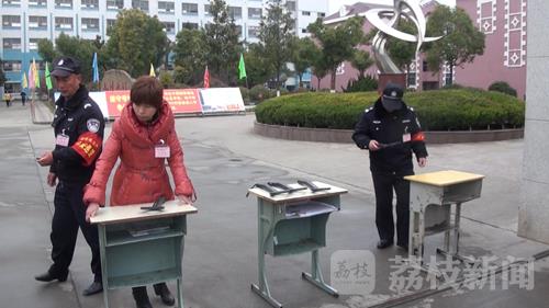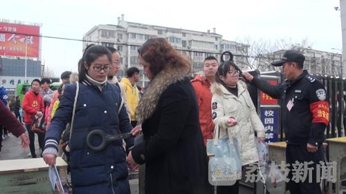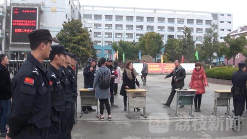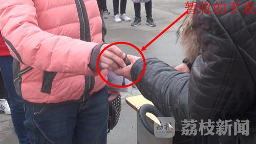早上7点30分左右,记者赶到射阳县第二中学考场时,前来维持考场秩序的特警队员一字排开,站在大门口的两侧,门前的解放路上,多名交警在指挥疏导前来送考的车辆有序停靠,佩带执勤标志的安保人员正在对所有考生进行逐一安检,防止有人携带手机、手表等电子产品进入考场。在正对大门口的内侧,几块醒目的提醒牌摆放在那里,提醒广大考生不要携带具有发送、接受信息功能的电子设备,执勤的安保人员在旁边也不时提醒携带手机、手表的考生,将手机、手表交给送考的家长或老师,也可交到值班室委托安保人员代为保管。在门口的检查台子上,摆放了一只塑料面盆,不长的时间里,就暂收了有近百只的手表。面对记者的询问,一名考生告诉记者,虽然老师提醒过他们,不要携带手机、手表等电子产品,但他们有时也需要和他人联系和看时间,所以就忘记交给家长保管了。