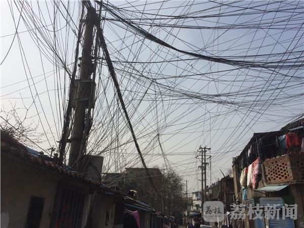 近日荔枝网友经过南京下关金燕路,在金陵村附近东侧一条无名小巷内,抬头向上望去,只见头顶电线密布,横一条竖一根,五颜六色,杂乱无章,电线分布最为密集,私接电线如蜘蛛网般密密麻麻,如同一张空中“蜘蛛网”,触目惊心