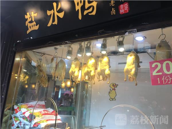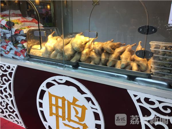 记者跟随南京市秦淮区食药监局的执法人员首先来到了夫子庙文德桥边上的王顺兴小吃城,临街的橱窗里摆放着几十只香气诱人的盐水鸭。老板介绍说,他们的鸭子都是当天采购、当天销售。