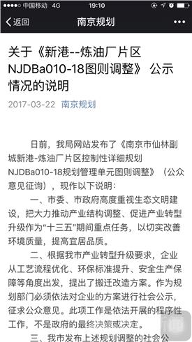 3月22日晚,南京市规划局官方微博发布“关于《新港--炼油厂片区NJDBa010-18图则调整》公示情况的说明”。该说明称,南京市委、市政府高度重视生态文明建设,把大力推动产业结构调整、促进产业转型升级作为“十三五”期间重点任务,以切实改善环境质量,提高宜居品质。根据南京市产业转型升级要求,企业从工艺流程优化、环保标准提升、安全生产保障等角度出发,提出了搬迁改造方案。作为规划部门必须依法对企业的方案进行社会公示,征求公众意见。此项工作是依法开展的程序性工作,不是政府的最终决策或决定。