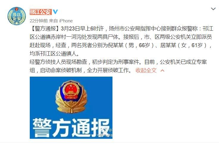 3月23日早上6时许,扬州市公安局指挥中心接到群众报警称:邗江区公道镇赤岸村一河沟处发现两具尸体。接报后,市、区两级公安机关立即派员赶赴现场,经查,两名死者分别为倪某某(男,66岁)、居某某(女,61岁),均系邗江区公道镇人。