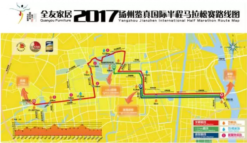 (一)半程马拉松路线:起点(马拉松公园)→滨水路→文昌东路→文昌中路→泰州路→高桥路→万福西路→瘦西湖路→平山堂东路→扬子江北路→文昌西路→终点(扬州体育公园)
