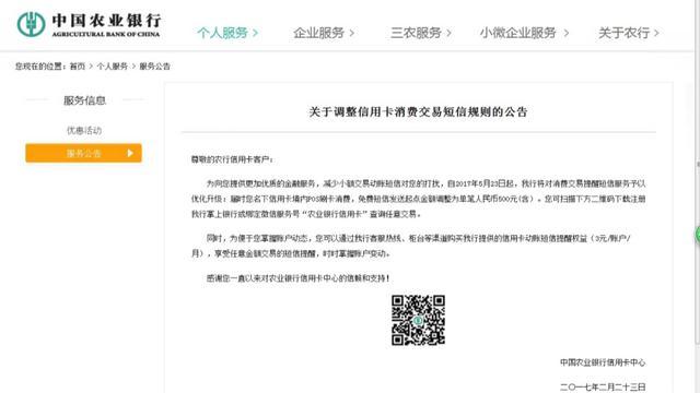 最近,农业银行发布公告称,自今年5月起,信用卡境内POS机刷卡消费免费短信发送起点金额调整为单笔500元,客户以后要掌握任意金额的交易动态短信提醒,每月须支付3元的短信提醒服务费。事实上,此前,建行、交行、兴业、中信等多家银行均发布公告,取消小额账户变动免费提醒短信,如需提供短信提醒,需每月支出2到3元的服务费。银行方面表示,短信提醒不再免费,一方面是为了缩减成本,另一方面也是引导更多客户使用微信银行、手机银行等移动客户端。